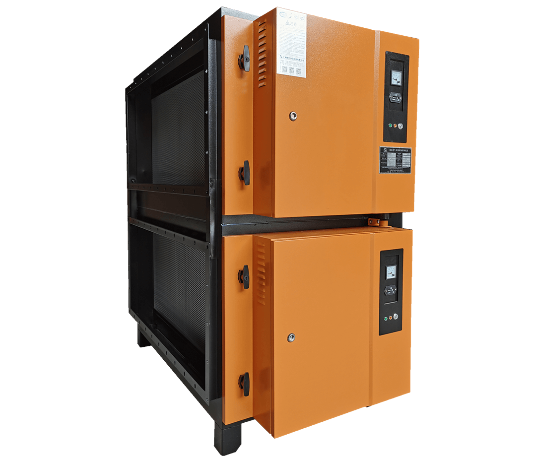 利用高壓電場原理,通過高頻電源裝置與靜電組合模板一一對應,形成電場分布,使油煙粒子荷電后在另一極板上吸附,從而對油煙粒子及粘性粉塵進行高效捕集,并對氣味進行分解凈化。
